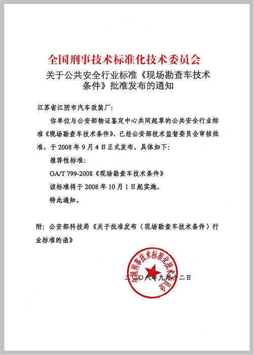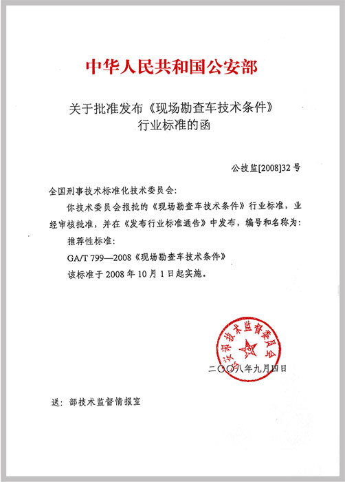 由我單位與公安部物證鑒定中心共同起草的公共安全行業(yè)標(biāo)準(zhǔn)《現(xiàn)場勘查車技術(shù)條件》,已經(jīng)公安部技術(shù)監(jiān)督委員會(huì)審核批準(zhǔn),于2008年10月1日起實(shí)施。